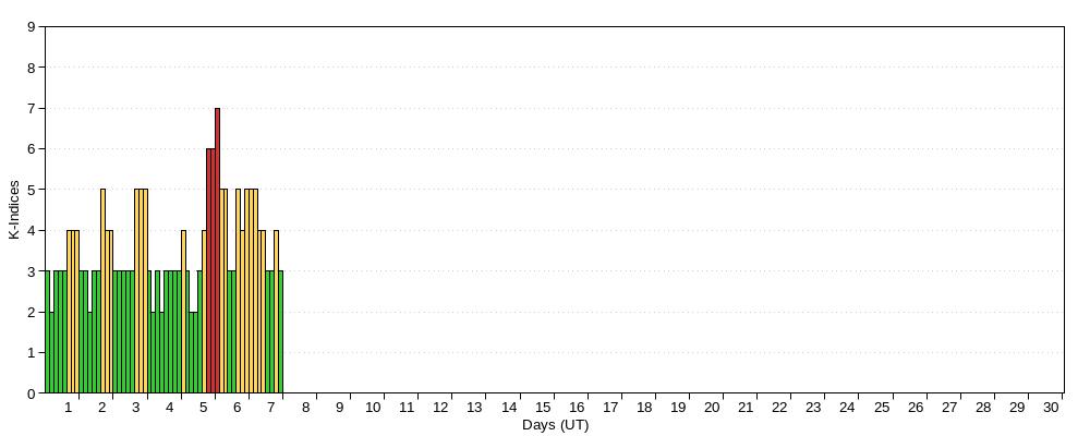 The K-index, presented on these pages, is calculated by the J. Bartels algorithm. The raw data are coming from the fluxgate magnetometer, operating in Borok Geophysical observatory. The quiet-day curve of magnetic field is calculated as median averages from quiet days for each month. The deviations are converted using a semi logarithmic table created by J. Bartels, in to 3 hour K indices. The K-index is calculated from the more disturbed component (X or Y).