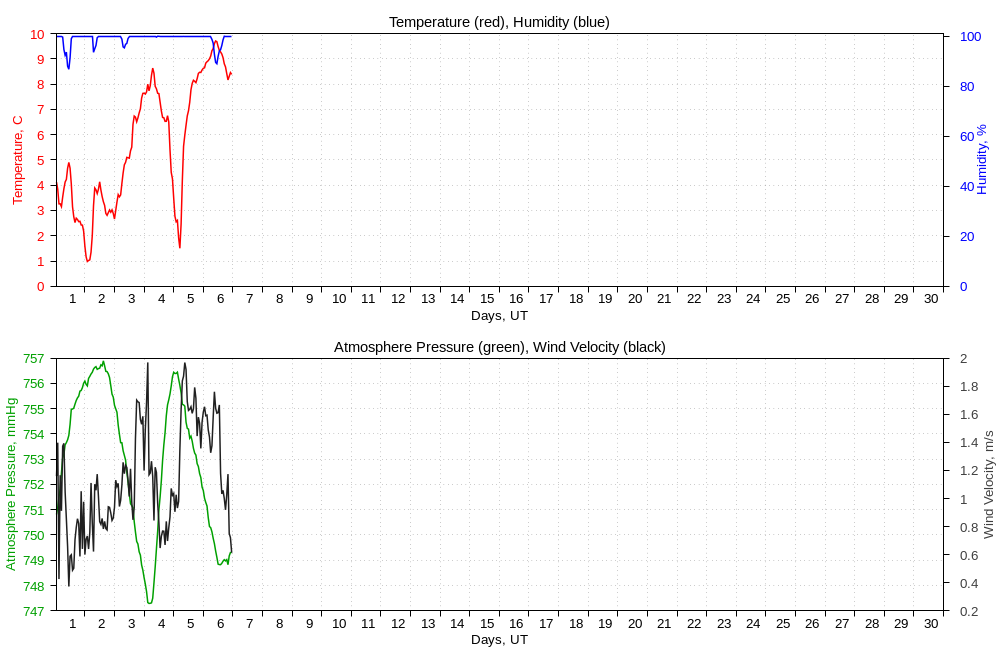 The meteorological data are provided by weather station AMK-03 (WS-2800 for data before April, 2019, WS-2500 for data before June, 2018) and are averaged by one hour time period.